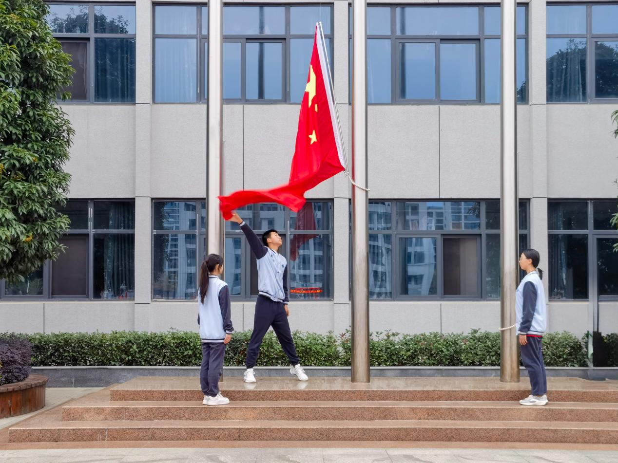飘扬的国旗,见证着我们守护校园平安的决心。初中英语教师柯双庆和学生代表倡导全体师生携手共进,将消防安全深深地刻在心中,用实际行动去维护校园的安全,让平安永远与我们的校园相伴。