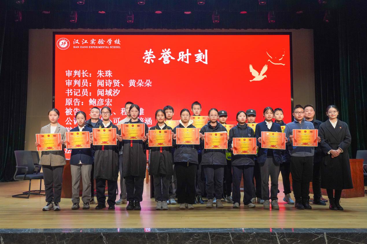 校长陈磊为16位“小演员”颁发荣誉证书,表彰他们在模拟法庭“审理”过程中活学活用法律知识的出色表现。