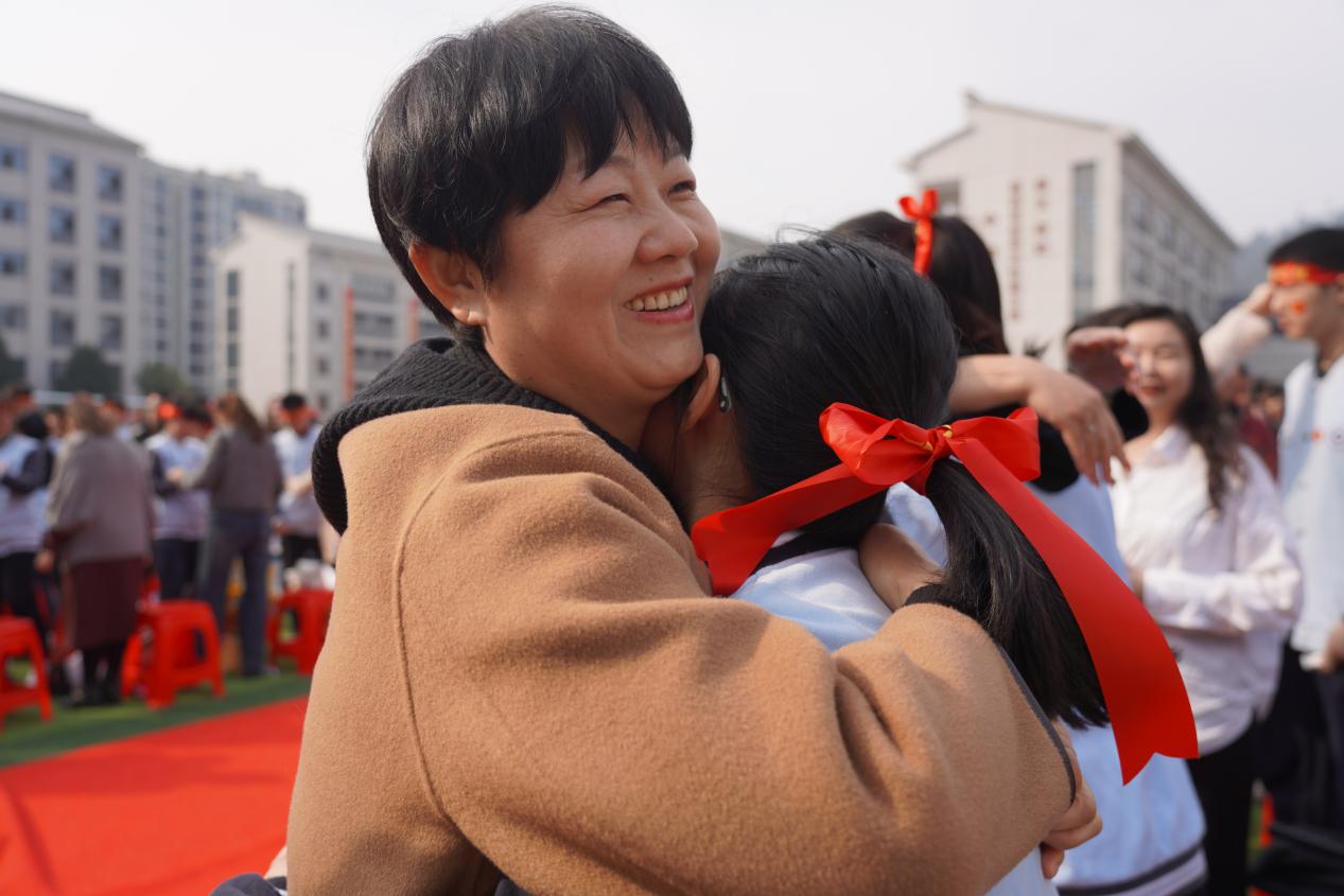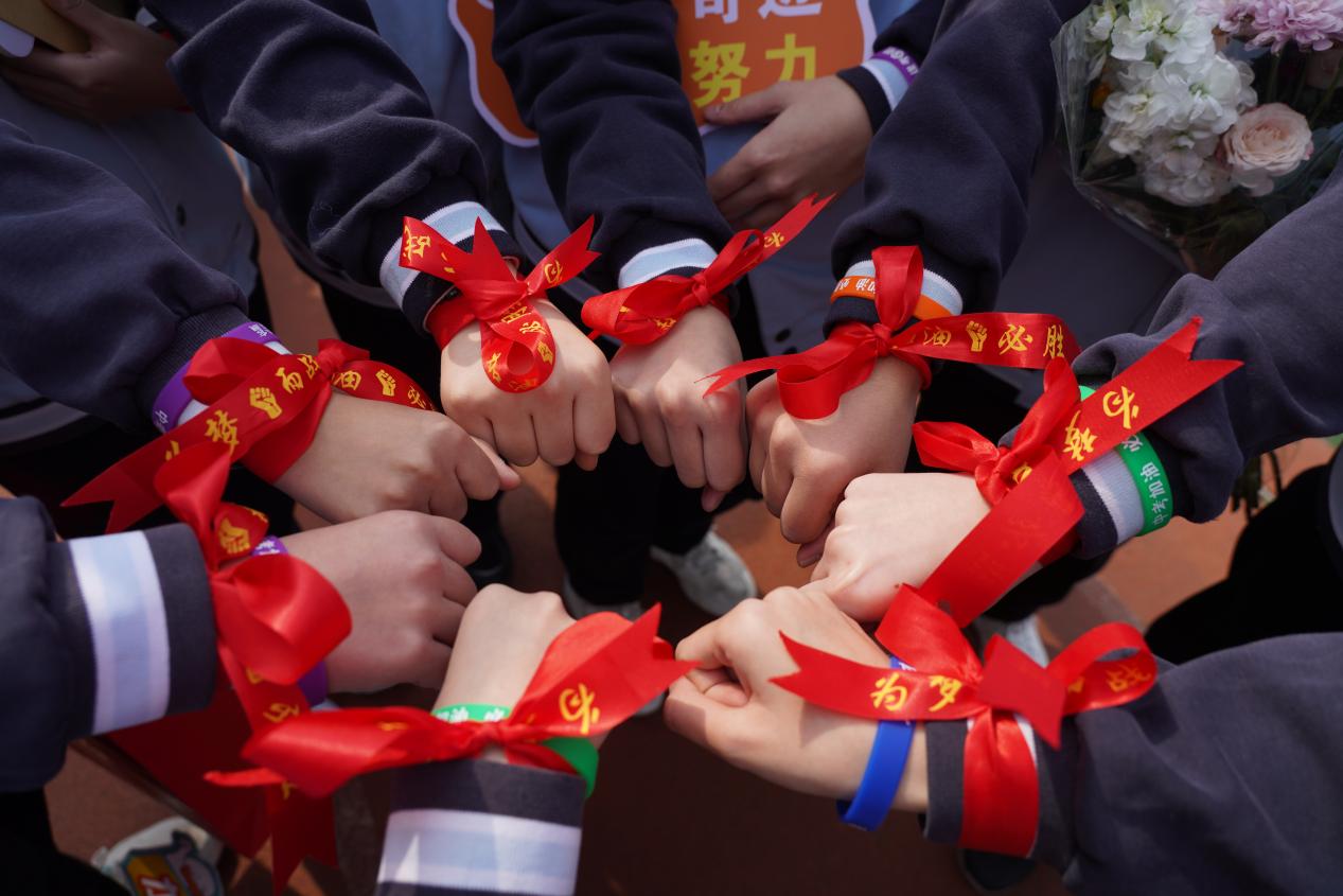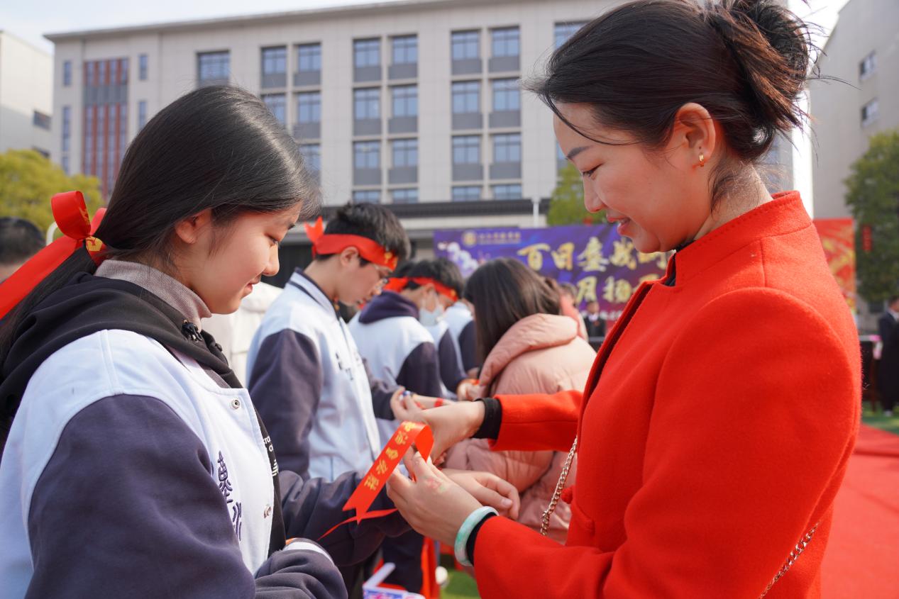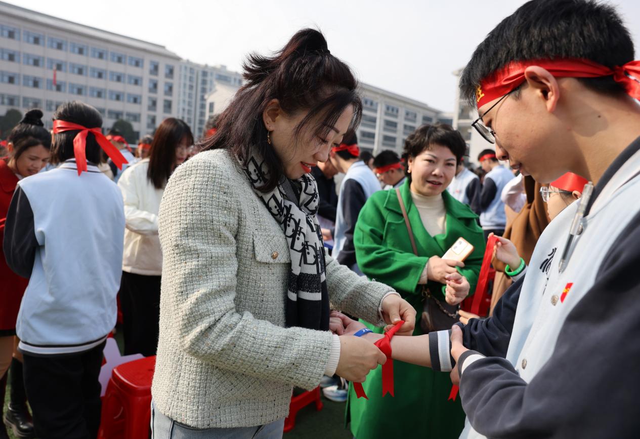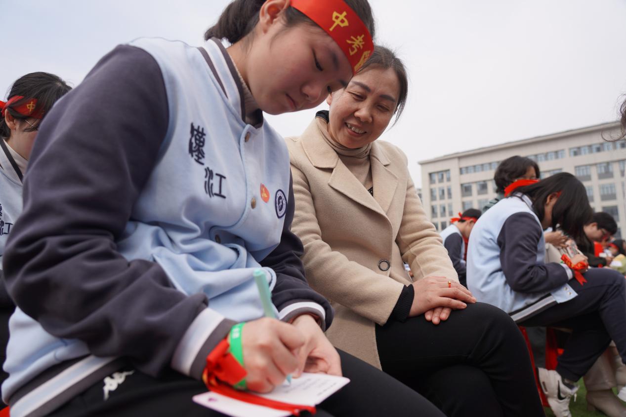 九位家长代表深情朗诵《致我的孩子》,字里行间是血脉相连的深情与携手同行的承诺。在温馨感人的氛围中,家长们为学生系上象征着祝福与期望的腕带,将满满的爱意传递给孩子。