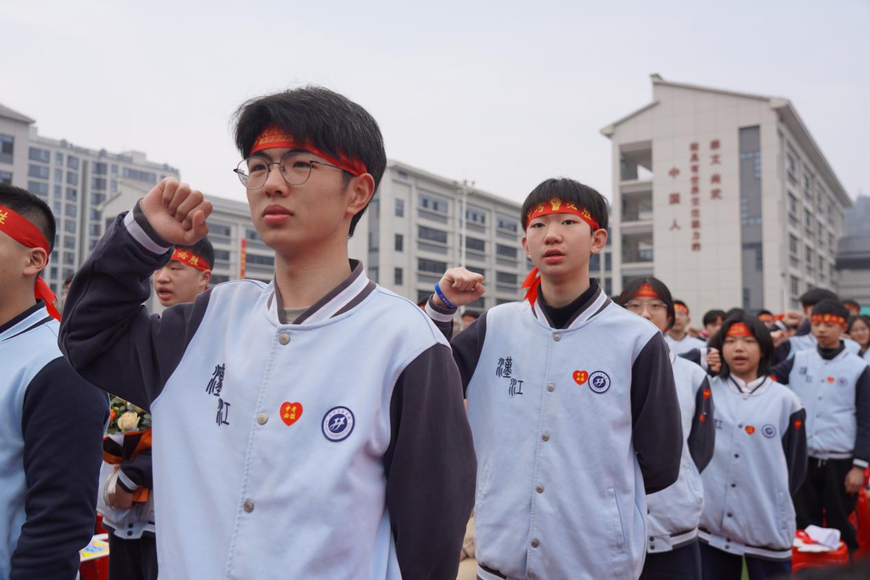 在九(1)班王虎臣同学的领誓下,全体学生昂首挺胸,紧握右拳,发出青春的最强音,誓言铮铮响彻校园。