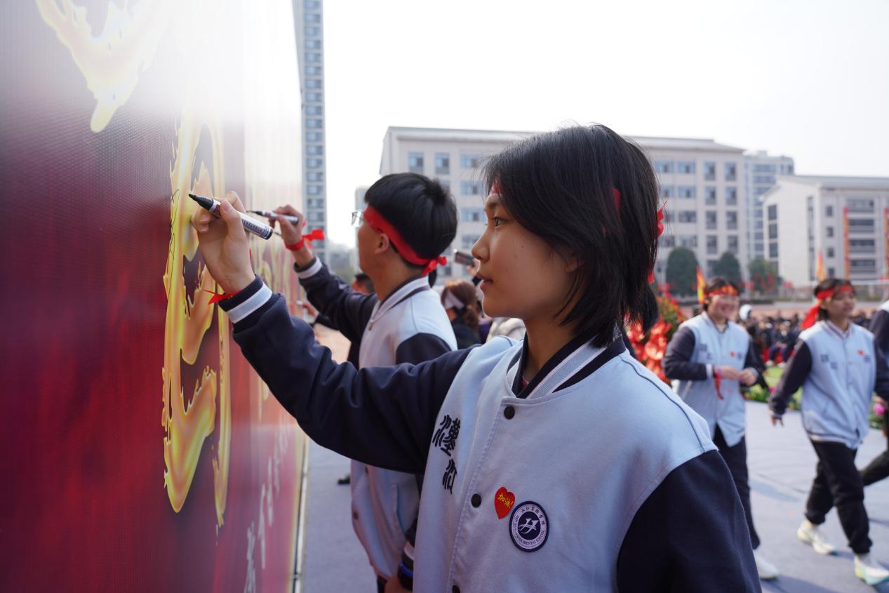 校领导、九年级学生代表和全体教师签名明志,每一个签名都代表着一份坚定的信念和对未来的期许。