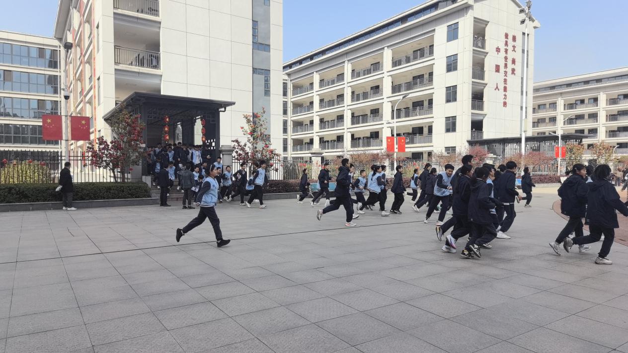 随着紧急疏散广播信号的响起,演练正式拉开帷幕。学校迅速启动应急处置预案,各岗位人员按照既定方案,有条不紊地组织学生疏散。在疏散过程中,老师们引导学生用手捂住口鼻,按照预定路线快速有序撤离,并巡场确保有无学生遗漏。全体学生听从指挥,行动敏捷,迅速抵达学校指定的集中安全区域。