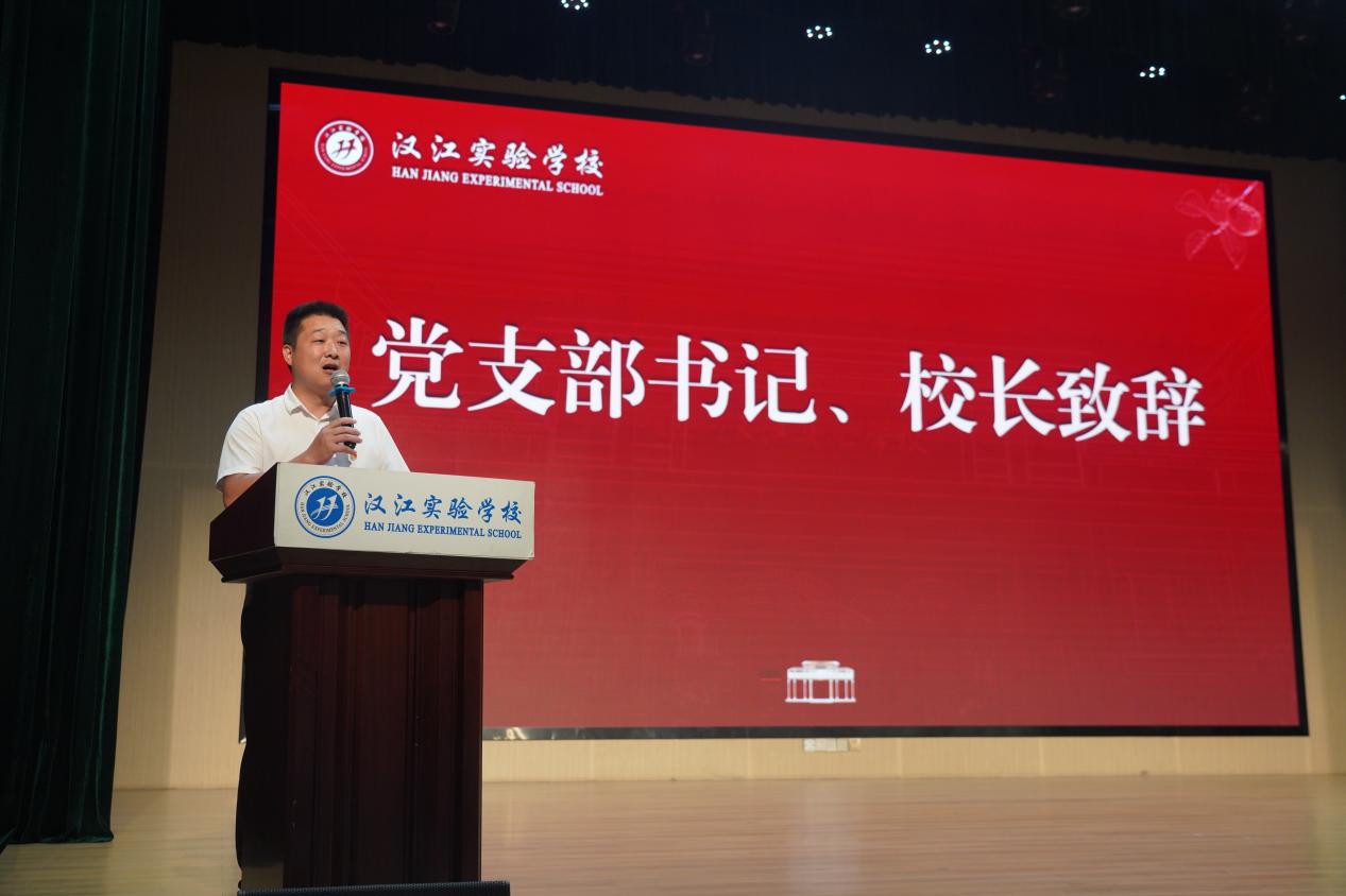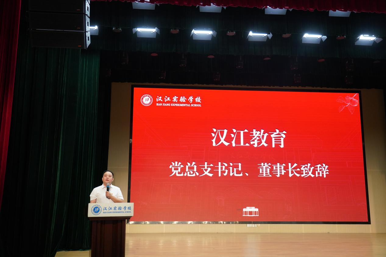 汉江教育党总支书记陈伟致辞。他表示,教育工作者肩负着呵护孩子未来、成就中华民族伟大复兴的光荣使命,我们既要注重中华优秀传统文化的传承,又要让学生掌握现代科学知识;既要厚植爱党爱国的红色精神,又要培养创新实践能力。他勉励全体教师要坚守教育初心,牢记育人使命,以更加饱满的热情投身教育事业,共同创造属于汉实的荣耀。