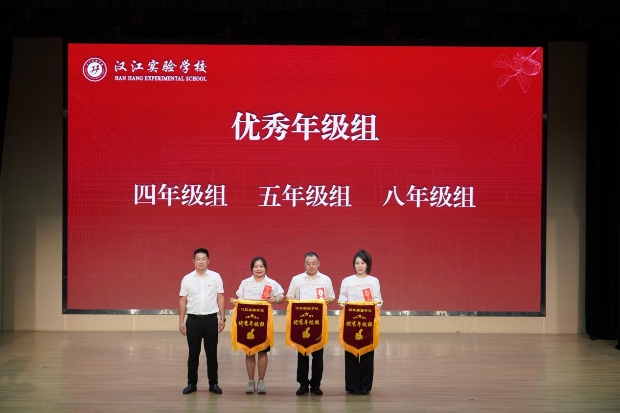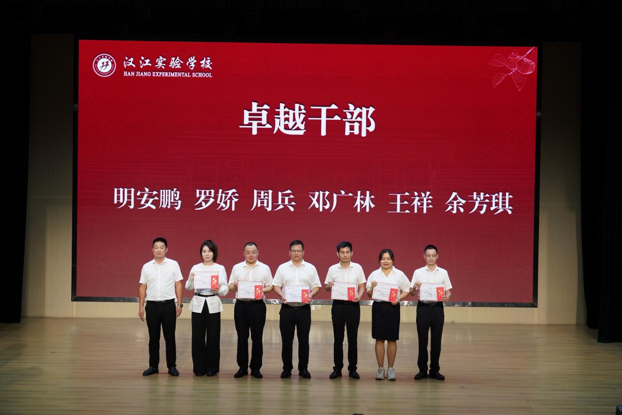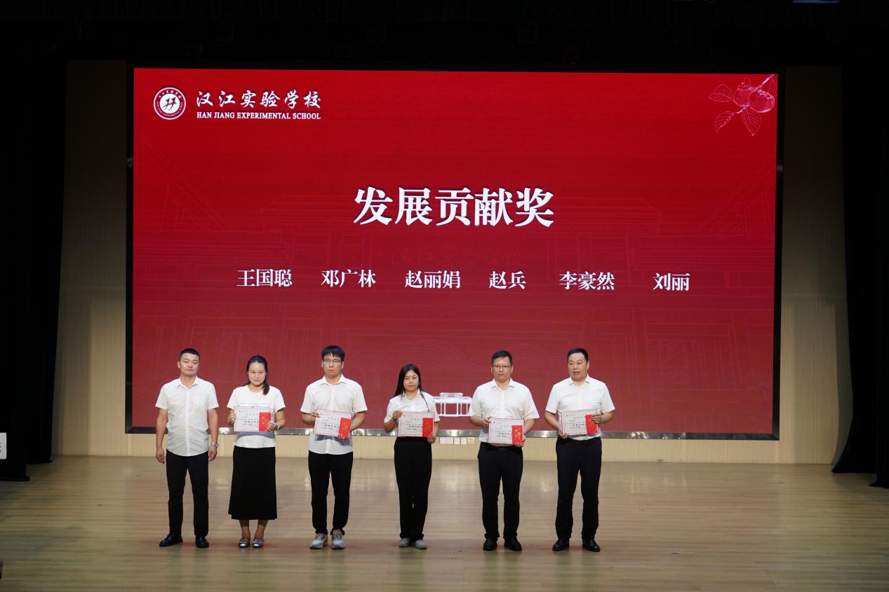 汉江教育党总支书记陈伟为汉江实验学校五位优秀管理团队成员颁发奖项,表彰他们在学校管理工作中的突出贡献。